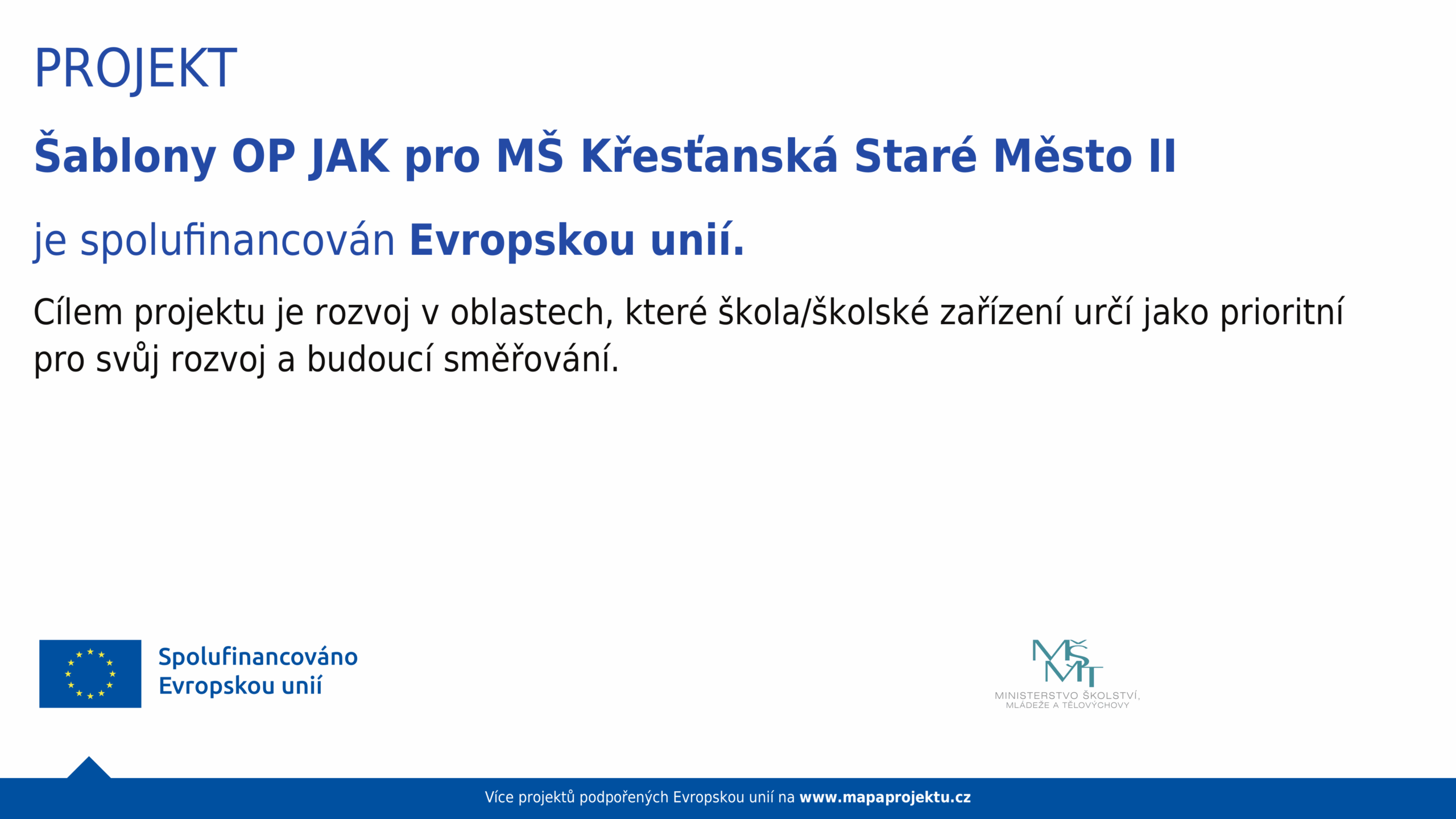 Cílem projektu je rozvoj v oblastech, které škola/školské zařízení určí jako prioritní pro svůj rozvoj a budoucí směřování.